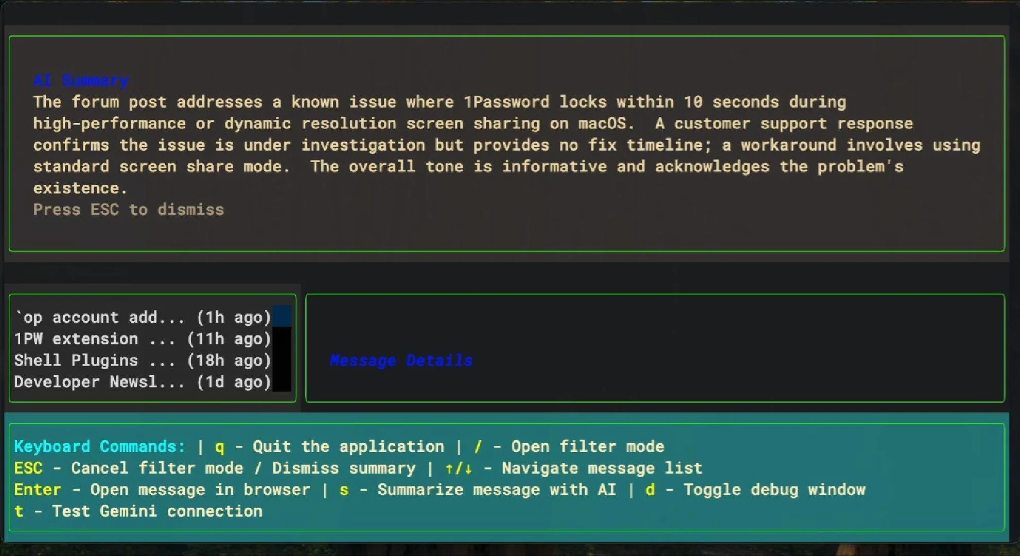 I run my app inside iTerm2’s Quake Visor mode with a quick key combo and the TUI drops down like a heads-up display. Read, scan, pop it away. It feels frictionless.